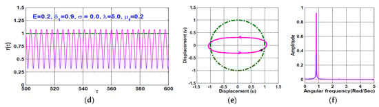 Figure 6 is a repetition for Figure 5 when the disc eccentricity . Figure 6a–c shows the system temporal oscillations, whirling motion, and frequency spectrum when , while Figure 6d–f illustrates the system temporal oscillations, whirling motion, and frequency spectrum when . It is clear from Figure 6c that the rotor system can perform chaotic oscillations at when , which agrees with Figure 4a,b. However, Figure 6f shows that the existence of rub-impact forces between the rotor and stator (i.e.,) can force the chaotic oscillation to become a periodic-1, which agrees with the bifurcation diagram given in Figure 4c.