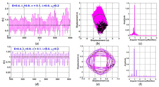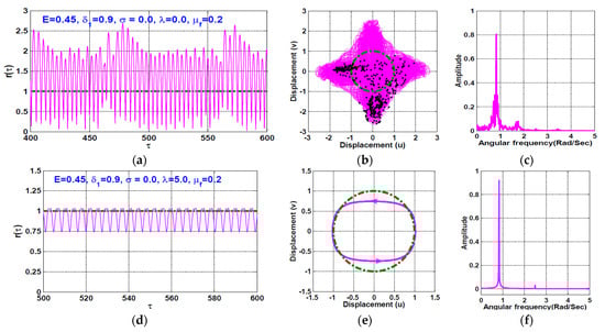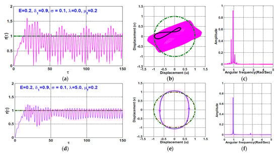 The temporal vibrations of the rotor system when according to Figure 7 are simulated in Figure 8 and Figure 9. Figure 8 simulates the radial oscillation, whirling orbit, and frequency spectrum of the AMBS system at when (as shown in Figure 8a,c), and when (as shown in Figure 8d–f). It is clear from Figure 8 that the quasiperiodic motion of the system that occurs when becomes a periodic one if the rub-impact force is considered (i.e., when ). Furthermore, Figure 9 shows the rotor system temporal oscillations at when , where Figure 9a–c shows that the rotor system can respond with chaotic oscillation when the rub and impact forces between the rotor and stator are zero. However, Figure 9d–f confirms that the existence of rub and/or impact forces between the rotor and the pole legs (i.e., ) can force the chaotic motions to become a periodic-13 one.