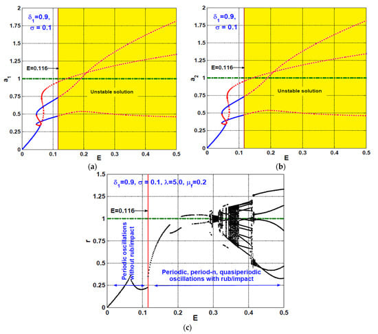 To investigate the oscillatory behaviors of the rotating disc when the rub-impact force occurs (i.e., when and ), the eccentricity response curve and the corresponding bifurcation diagrams are plotted as shown in Figure 4 when . Utilizing Equations (44)–(47), the system eccentricity response curves are obtained as in Figure 4a,b when . Figure 4a,b shows that the rotor system can vibrate with oscillation amplitudes lower than unity (i.e., and ) if the disc eccentricity , which means that the rotating disc can oscillate harmonically without rub and/or impact forces as long as . However, when increasing the disc eccentricity to become , the rotor system will perform at an oscillation amplitude higher than unity either in the horizontal or the vertical direction depending on the initial conditions (i.e., or ), resulting in rub and/or impact forces between the rotating disc and the pole legs. Moreover, Figure 4a,b illustrates that increasing the disc eccentricity beyond (i.e., ) results in losing the stability of the rotor system.