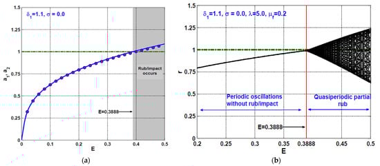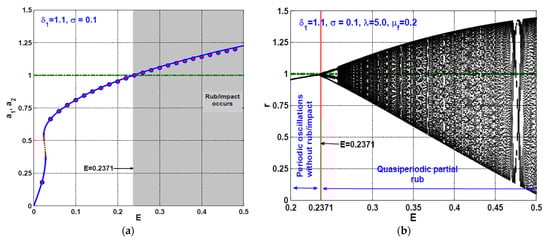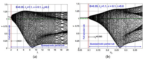 The rotor system bifurcation diagrams when and : (a) Stiffness coefficient versus when , and (b) friction coefficient versus when .