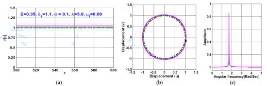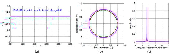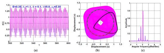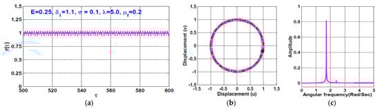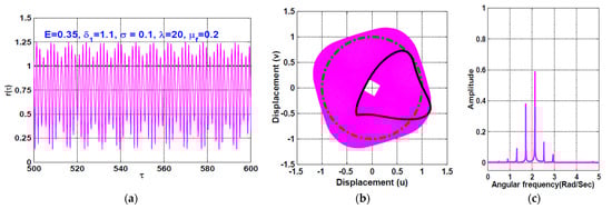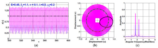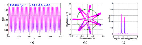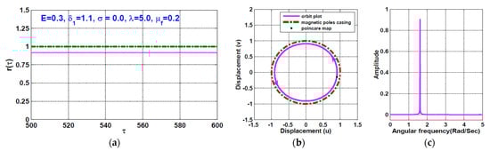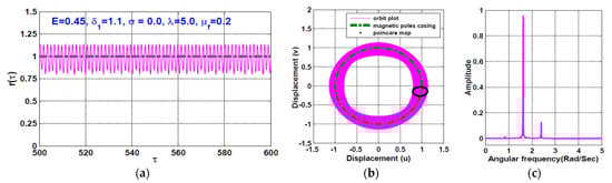 The temporal oscillation of the rotor system according to Figure 12 (i.e., when ) is simulated when the disc eccentricity as shown in Figure 13 and Figure 14, respectively. the figures are obtained via solving Equations (23) and (24) numerically when . It is clear from Figure 13 that the system performs periodic-1 motion with oscillation amplitudes lower than unity, where the rub-impact does not occur as is clear in Figure 13b. On the other hand, Figure 14 illustrates the rotor system temporal oscillations according to Figure 12 at . The figure confirms that the system oscillates with oscillation amplitudes higher than unity, resulting in rub-impact force between the rotor and the pole legs, which ultimately leads to quasiperiodic motion.