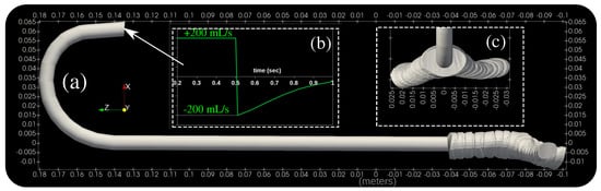 Endotracheal tube (ETT) 3D model of 8 mm internal diameter inserted into a human’s trachea. (a) The computational model used in the simulations; (b) the inhale/exhale applied flow rate boundary condition that mimics a real volume-controlled (VC) mechanical ventilation (MV); (c) upper view of the ETT showing the trachea first bifurcation.