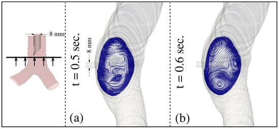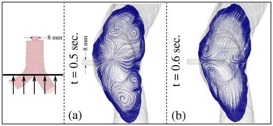 Figure 2 shows the local velocity streamlines in a cross-section post to the ETT extremity and before the bifurcation zone. At the end of the inhale period at t = 0.6 s (see Figure 2a), airflow asymmetry and small circulations near the trachea wall are observed. We have chosen those two times according to the flow rate cycle shown in Figure 1b. They represent the times at which the highest stresses can occur. The t = 0.5 s represents the maximum flow speed imposed during the inhalation period just before the exhalation period. The t = 0.6 s corresponds to the approximate maximum flow speed at the beginning of the exhalation period. At the beginning of the exhale period at t = 0.6 s (see Figure 2b), airflow asymmetry becomes less manifested with one big circulation (vortex) and the other three smaller vortices near the trachea wall. Note that strong vortices may induce damage to the trachea wall (e.g., inflammation, cracks), especially in patients with MV applied for long periods []. Figure 3 illustrates the local streamlines in a cross-section post to the ETT extremity and very close to the first bifurcation zone inside the trachea. At the end of the inhale period at t = 0.5 s (see Figure 3a), airflow symmetry and four medium to large vortices near the trachea wall are observed. At the beginning of the exhale period at t = 0.6 s (see Figure 3b), airflow symmetry is still prevailing, but with four small vortices at different positions compared to those observed at t = 0.5 s in Figure 3a.