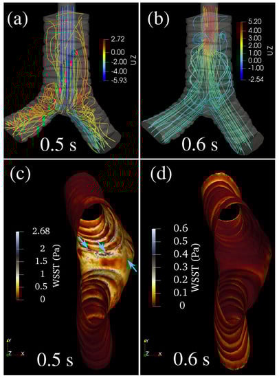 Three dimensional velocity streaklines (a,b) colored by the axial velocity values (m/s), and the local wall shear stress (c,d) values (Pa) observed from a top view perspective. (a,c) At the end of the inhale period at t = 0.5 s; (b,d) at the beginning of the exhale period at t = 0.6 s. The small arrows in (c) indicate high local WSS values.