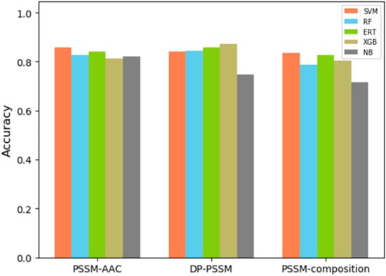 In this section, five commonly used machine learning algorithms, including SVM, random forest (RF), extreme gradient boosting machine (XGB), extremely randomized trees (ERT), and NB, were adopted to compare their performance for the PVP’s prediction by using three different feature encoding methods. All the experiments were performed on the D1_Train dataset by utilizing the jackknife CV, and the results are illustrated in Figure 2 and Figure 3.