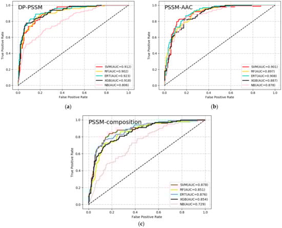 The ROC curves of different classifiers using different features. (a) ROC curves based on the DP-PSSM descriptor. (b) ROC curves based on the PSSM-AAC descriptor. (c) ROC curves based on the PSSM-composition descriptor.