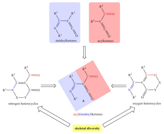 Recently, diversity-oriented synthesis (DOS), a technique for transforming a group of simple and similar starting materials into a collection of more complex and diverse products [1], has become an important trend in drug discovery [1,2,3,4,5,6,7,8,9]. DOS allows us to explore wider chemistry space, including currently deficiently presented (or even vacant) space and, in perspective, space correlating best with needed properties [1]. Implementation of DOS requires available polyfunctional building blocks with studied chemical properties to predict and tune their chemical behavior in the developing strategy. Acyl(imidoyl)ketenes A are well suited to these requirements, as these molecules bear a forked diene fragment consisting of a C=C bond conjugated with geminal C=O and C=N patterns, which enables the development of DOS based on them with an emphasis on skeletal diversity (Scheme 1). Moreover, immediate reactions of some types of acyl(imidoyl)ketenes A afford the formation of symmetric products, which could possibly increase the likelihood of the occurrence of useful biological properties in them [10,11].