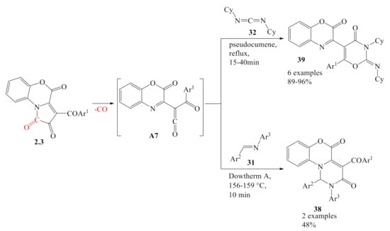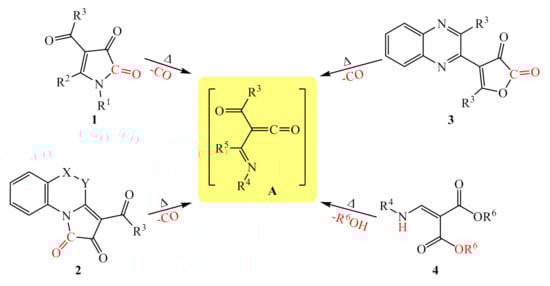 Acyl(imidoyl)ketenes A belong to the category of highly reactive compounds. Most often, they are generated in the result of the elimination of carbon monoxide (CO) from monocyclic 4-acyl-1H-pyrrole-2,3-diones 1 or their [e]-fused analogs 2 under thermolysis conditions at temperatures above 110 °C (Scheme 2) [36,37,38,39,40]. Another approach to acyl(imidoyl)ketenes A is based on the thermolysis of (quinoxalin-2-yl)furan-2,3-diones 3 (Scheme 2) [41]. Moreover, generation of acyl(imidoyl)ketenes A is possible in the course of Gould–Jacobs reaction via the thermolysis of 2-(aminomethylene)malonates 4 [42,43].