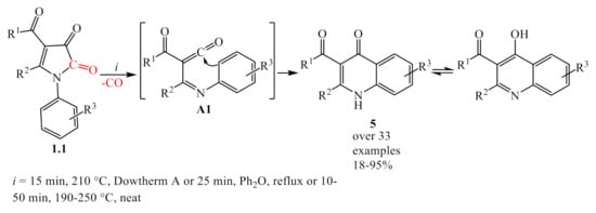 At thermolysis of 4-acyl-1-aryl-1H-pyrrole-2,3-diones 1.1, N-aryl substituted acyl(imidoyl)ketenes A1 are generated, which undergo intramolecular cyclization through acylation of the ortho CH group of the benzene ring at nitrogen atom by the ketene moiety to result in quinoline-4(1H)-ones 5 (Scheme 3) [36,37,38,40,46,47,48,49,50,51]. The presence of one substituent in the ortho position of the benzene ring at nitrogen atom in 4-acyl-1-aryl-1H-pyrrole-2,3-diones 1.1 and, further, in ketenes A1, does not influence the reaction mode, and does not reduce the yields of compounds 5, which reflects the ease of the intramolecular acylation process [47]. In addition, there is no noticeable effect of substituents in meta positions of the benzene ring at the nitrogen atom on the yield of the target products 5 [50].