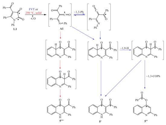 The mechanism of this transformation was studied using 13C labels under FVT conditions (650 °C, gas phase) and under melting solid conditions (250 °C, phase transition from solid to liquid) [40]. 2,3-13C-Labelled 4-benzoyl-1,5-diphenyl-1H-pyrrole-2,3-dione 1.1 was used as a starting material (Scheme 4). Under FVT conditions, a ketene–ketene rearrangement proceeding through a 1,3-shift of phenyl group with the formation of quinolones 5′, 5″ was observed. However, under common melting solid conditions of the starting pyrroledione 1.1, no rearrangement was observed, and quinolone 5‴ was a single product.