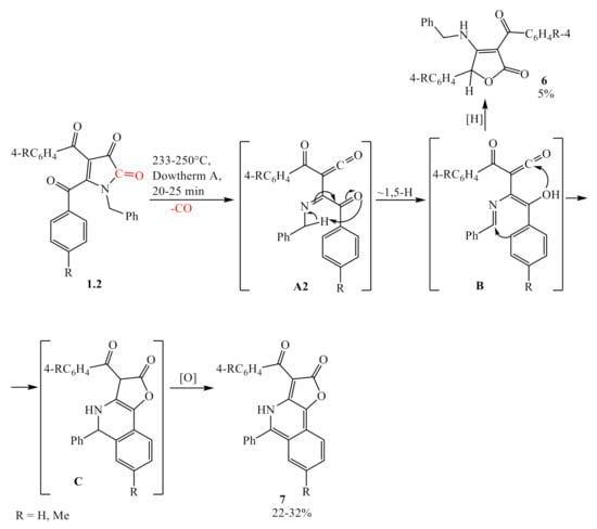 Thermolysis of 4-acyl-1-benzyl-1H-pyrrole-2,3-diones 1.2 leads to the formation of acyl(N-benzylimidoyl)ketenes A2 (Scheme 5) [52]. N-Benzyl substituent plays an important role in further transformations of compounds A2 bearing it. Thus, acyl(N-benzylimidoyl)ketenes A2 undergo a [1,5]-prototropic shift (proton migrates from methylene group in benzyl moiety to the oxygen atom of acyl group) to result in hydroxyalkenyl ketenes B which undergo either intramolecular cyclization/reduction to 4-aminofuran-2-ones 6 or double intramolecular cyclization to 4,5-dihydrofuro[3,2-c]isoquinoline-2(3H)-ones C. Then, intermediates C are oxidized to furo[3,2-c]isoquinolin-2-ones 7 (Scheme 5).
