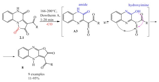 Thermolysis of N5-unsubstituted 3-acylpyrroloquinoxalinetriones 2.1 (analogs of 4-acyl-1H-pyrrole-2,3-diones 1 discussed in the above sections, in which pyrrole core is fused with quinoxaline fragment) results in the formation of N4-unsubstituted acyl(quinoxalin-2-yl)ketenes A3, in which imidoyl fragment C=N is a part of quinoxaline substituent (Scheme 6). Acyl(quinoxalin-2-yl)ketenes A3 cannot undergo intramolecular cyclization to quinoline-4(1H)-ones 5, as the ortho CH group of the benzene ring at N1 atom is spatially too far away from ketene moiety C=C=O. However, N4-unsubstituted acyl(quinoxalin-2-yl)ketenes A3 still undergo intramolecular cyclization, in contrast to their N4-substituted analogs, which are discussed below (Section 3.1.1 and Section 3.2). N4-Unsubstituted acyl(quinoxalin-2-yl)ketenes A3 exist as two tautomers, amide and hydroxyimine. Hydroxyimine form contains OH group prone to react with ketene moiety to form furo[3,2-b]quinoxalines 8 [53,54,55] (Scheme 6). It should be mentioned that there were attempts to trap ketenes A3 by various dienophiles, but all of them were unsuccessful [55].