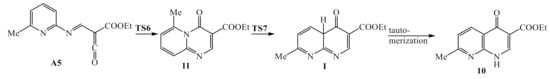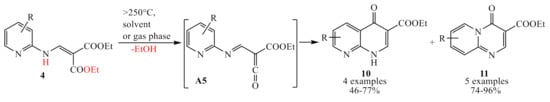 Thermolysis of diethyl 2-((pyridin-2-ylamino)methylene)malonates 4 leads to acyl(imidoyl)ketenes A5, which immediately undergoes intramolecular cyclization via acylation by ketene moiety of one of two reaction centers to afford 1,8-naphthyridines 10 (attack on the ortho-CH group) and/or 4H-pyrido[1,2-a]pyrimidines 11 (attack on the ortho-N atom) (Scheme 9) [42,43]. 4H-Pyrido[1,2-a]pyrimidines 11 are major products of this transformation under FVT (gas phase, contact times of 0.3 s, 450 °C) conditions and are kinetic products. While in solution phase, the regioselectivity is highly dependent on the substituent position, as the cyclization is controlled by steric characteristics. Moreover, 1,8-naphthyridines 10 are formed as a result of thermal rearrangement of 4H-pyrido[1,2-a]pyrimidines 11 and, thus, are considered to be thermodynamic products.