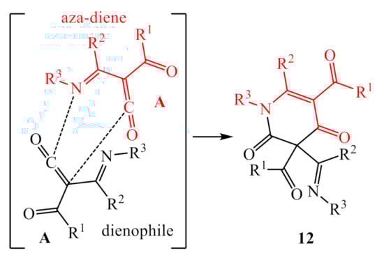 As acyl(imidoyl)ketenes A bear C=C–C=N and C=C–C=O diene fragments, which, hypothetically, can react with one another intermolecularly, both as dienes and dienophiles, one can assume that a difficult mixture of products would be formed in such reactions. However, experimental studies of cyclodimerization reactions of acyl(imidoyl)ketenes A have shown that, in their case, the reaction proceeds selectively, where one ketene A molecule acts as C=C–C=N diene, and the other as C=C dienophile, to form corresponding pyridine derivatives 12 (Scheme 11) [57,58,59,60,61,62,63].