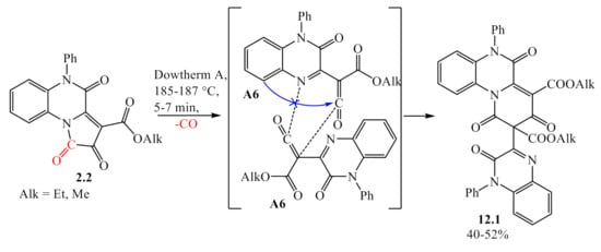 This pattern of cyclodimerization is a characteristic of acyl(imidoyl)ketenes A generated from 4-acyl-1H-pyrrole-2,3-diones 2 fused at [e]-side with a heterocyclic fragment. Such acyl(imidoyl)ketenes A cannot undergo intramolecular cyclization (except for some cases such as N4-unsubstituted acyl(quinoxalin-2-yl)ketenes A3, Section 2.3), as ortho CH group of the benzene ring at N1 atom or other nucleophilic centers are spatially too far away from ketene moiety C=C=O (Scheme 12). For example, such a pattern of immediate transformations is observed in the case of N4-phenyl substituted acyl(quinoxalin-2-yl)ketenes A6 generated from N5-phenyl substituted 3-acylpyrroloquinoxalinetriones 2.2 (Scheme 12) [57]. These N4-phenyl substituted acyl(quinoxalin-2-yl)ketenes A6 undergo cyclodimerization via [4+2]-cycloaddition pathway, in which one ketene molecule plays the role of aza-diene, and the other one acts as C=C dienophile, to form 9-(3-oxo-3,4-dihydroquinoxalin-2-yl)-5H-pyrido[1,2-a]quinoxaline-6,8,10(9H)-triones 12.1 (Scheme 12) [57].
