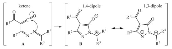 It should be emphasized that formation of compounds 14, 15 is not observed in the case of similar ketenes A4 bearing (((2-bromophenyl)(phenyl)methylene)hydrazono) substituent, apparently due to the fact that corresponding zwitterions D1 quickly undergo intramolecular cyclization to benzo[e]pyrazolo[5,1-b][1,3]oxazines 9 (Scheme 9, Section 2.4) [56].
