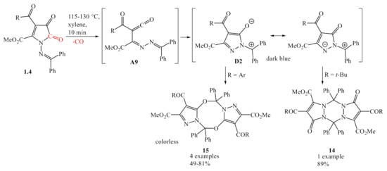 These types of methyleneamino substituted acyl(imidoyl)ketenes A9 are readily generated from 1-[(diphenylmethylidene)amino] substituted 4-acyl-1H-pyrrole-2,3-diones 1.4 (Scheme 15) [64,65]. Formed zwitterions D2 undergo dimerization reaction through two possible pathways in the dependence on the type of acyl substituent COR. When acyl substituent is pivaloyl (R = t-Bu), zwitterions D2 participate in [3+3]-cycloaddition reaction as 1,3-dipoles to form symmetric tetrazines 14, and when acyl substituent is aroyl (R = Ar), zwitterions D2 participate in [4+4]-cycloaddition reaction as 1,4-dipoles to form symmetric bis-pyrazolodioxadiazocines 15 (Scheme 15). Formation of compounds 15 is a reversible process, which is indicated visually by the change of their solutions’ color from colorless to dark blue when their solutions are heated, and vice versa, when cooled [64,65]. Due to this property, compounds 15 can be successfully used in synthetic procedures as a source of zwitteriones D2 [65].