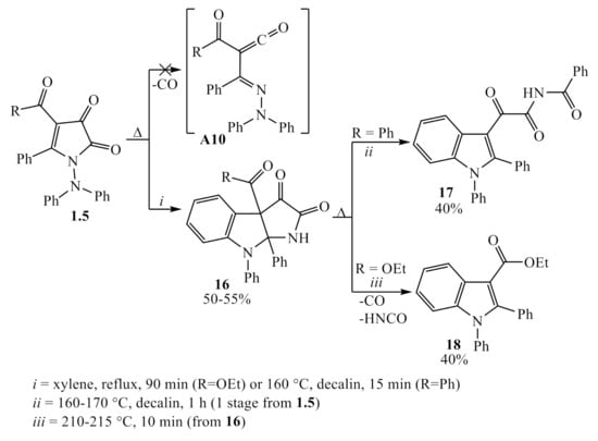 In addition, 1-diphenylamino substituted 4-acyl-1H-pyrrole-2,3-diones 1.5 do not afford acyl(imidoyl)ketenes A10 prone to formation of zwitterions (Scheme 16) [66]. Instead, when heated, compounds 1.5 undergo a kinetically controlled isomerization to 1,3a,8,8a-tetrahydropyrrolo[2,3-b]indole-2,3-diones 16. Further heating of pyrrolo[2,3-b]indole-2,3-diones 16, which have a benzoyl substituent at C3a, results in isomerization to thermodynamically stable N-(2-(1,2-diphenyl-1H-indole-3-yl)-2-oxoacetyl)benzamide 17 (Scheme 16). However, the heating an analogous pyrrolo[2,3-b]indole-2,3-dione 16, bearing an ester group at C3a, leads to another thermolysis product, ethyl 1,2-diphenyl-1H-indole-3-carboxylate 18 (Scheme 16).