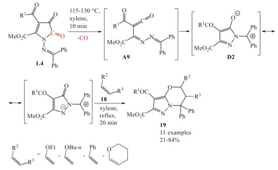 Zwitterions D2, formed as a result of intramolecular cyclization of methyleneamino substituted acyl(imidoyl)ketenes A9, react with alkenes 18 to afford pyrazolo[5,1-b][1,3]oxazines 19 (Scheme 17) [64,67]. This reaction proceeds regioselectively; zwitterions D react as 1,4-CNCO-dipoles, and alkenes 18 react as C=C dipolarophiles. Trapping reagents 18 are added to the reaction mixture after thermolysis of compounds 1.4 is finished.