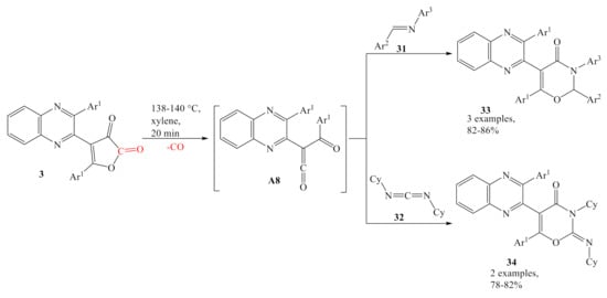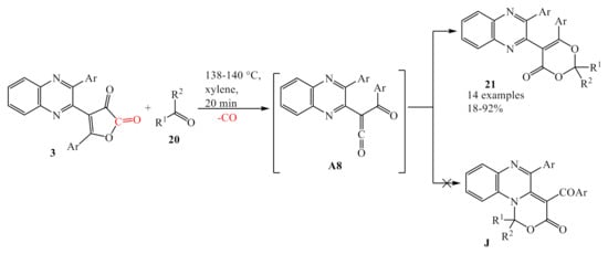 Acyl(imidoyl)ketenes A8 generated from (quinoxalin-2-yl)furan-2,3-diones 3 react with carbonyl compounds 20 (aldehydes and ketones) to form exclusively 5-(quinoxalin-2-yl)-4H-1,3-dioxin-4-ones 21 (Scheme 18) [68,69]. Trapping reagents 20 are added directly to the reaction mixture before heating. Ketenes A react as oxa-dienes, and carbonyl compounds 20 react as oxa-dienophiles. The reaction proceeds regioselectively, and formation of alternative products, [1,3]oxazino[3,4-a]quinoxalin-3-ones J, is not observed (Scheme 18).