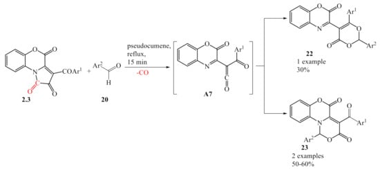 Acyl(imidoyl)ketenes A7 generated from 3-aroylpyrrolobenzoxazinetriones 2.3 nonselectively react with aromatic aldehydes 20 to form a mixture of 3-(4-oxo-4H-1,3-dioxin-5-yl)-2H-benzo[b][1,4]oxazin-2-ones 22 and 1H-benzo[5,6][1,4]oxazino[4,3-c][1,3]oxazine-3,5-diones 23 (Scheme 19) [71]. Trapping reagents 20 are added directly to the reaction mixture before heating. Such a change in selectivity of reaction of acyl(imidoyl)ketenes A7 [71], in comparison with acyl(imidoyl)ketenes A8 [68,69], can be caused by two factors. It can be connected to the influence of heterocyclic substituent incorporating imidoyl moiety C=N of ketenes A or to the influence of reaction temperature (it is much lower in the case of ketenes A8).