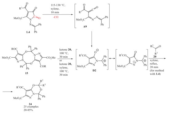 Synthetic approach based on generation of zwitterions D2 via intramolecular cyclization of methyleneamino substituted acyl(imidoyl)ketenes A9 obtained from thermolysis of compounds 1.4 is suitable for the reaction with aromatic aldehydes 20 [64], and the approach through thermal dissociation of symmetric bis-pyrazolodioxadiazocines 15 is suitable for reactions with ketones 20 [65]. This can be explained by the fact that products 24, derived from ketones 20, are less thermally stable than their analogs derived from aldehydes 20 and, thus, lower reaction temperatures are required for their synthesis, which is easily achieved in the approach via bis-pyrazolodioxadiazocines 15.