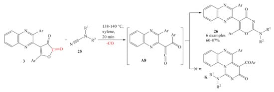 Acyl(imidoyl)ketenes A8 generated from (quinoxalin-2-yl)furan-2,3-diones 3 react with cyanamides 25 to form 5-(quinoxalin-2-yl)-4H-1,3-oxazin-4-ones 26 as sole products (Scheme 21) [72]. Trapping reagents 25 are added directly to the reaction mixture before heating. Ketenes A8 react as oxa-dienes, and cyanamides 25 react as aza-dienophiles. The reaction proceeds regioselectively, and formation of alternative products, 3H-pyrimido[1,6-a]quinoxalin-3-ones K, is not observed (Scheme 21). It should be mentioned that ketenes A8 do not react with acetonitrile and substituted benzonitriles 27 [72]. In this case, only dimers 13.3 are isolated as products.
