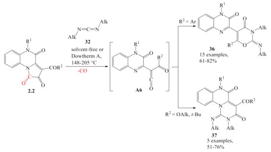 In addition, N4-substituted acyl(quinoxalin-2-yl)ketenes A6 generated from N5-substituted 3-acylpyrroloquinoxalinetriones 2.2 do not react with benzonitriles 27 [70]. Additionally, their reaction with cyanamides 25 proceeded before thermal decarbonylation, and unspecified adducts of compound 2.2 with cyanamides 25 were detected as the major components of the reaction mixtures [70].