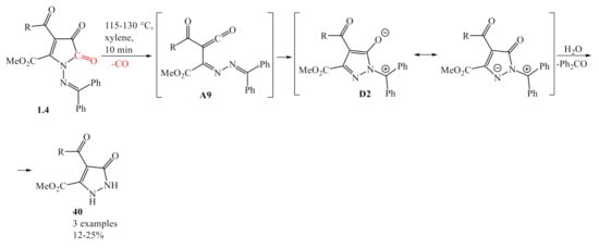 Thus, zwitterions D2, formed as a result of intramolecular cyclization of methyleneamino substituted acyl(imidoyl)ketenes A9, react with water to afford pyrazolones 40 (Scheme 27) [67]. This process is accompanied by formation of benzophenone Ph2CO.