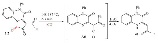 N4-Phenyl substituted acyl(quinoxalin-2-yl)ketenes A6 generated from N5-phenyl substituted 3-acylpyrroloquinoxalinetriones 2.2 react with water to result in corresponding enamines 41 (Scheme 28) [54]. The same hydrolysis pathway is likely typical for other similar ketenes A6-A8, generated from [e]-fused 1H-pyrrole-2,3-diones 2 or furan-2,3-diones 3.