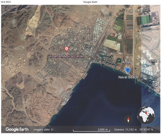 Map showing, encircled, the location of the “Ardag Beach” in Eilat, Israel, where the endemic Red Sea ghost crab (Ocypode saratan) can still be seen (Google Maps).