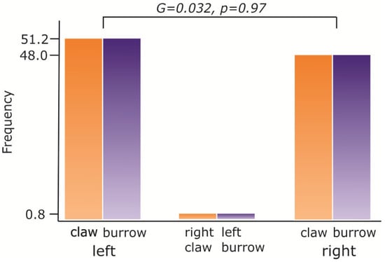 In fiddler crabs (Uca mjoebergi), claws had distinct forces that resulted in different outcomes during fights between conspecific males [29]. In some populations, left-clawed males were a minority and disadvantaged in burrow retainment and when in duels with right-clawed males [30]. Tina, F.W., et al. [31] found that the fighting duration between sparring males was longer if they were homoclawed, but that in burrow retainment fights, residents were more successful than potential usurpers, irrespective of the handedness.