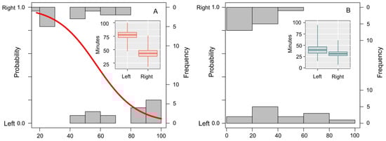 In the evening, right-clawed crabs ended activity immediately after sunset, and after 60 min, all individuals entered their burrows, while left-clawed crabs were active uniformly all evening and were observed even 100 min after sunset (β-coefficient ± SE = −0.58 ± 0.66, Z = −0.85, p = 0.378, R2 = 0.06, Figure 3B). In this case, we found no significant differences between the right- and left-clawed crabs (t = 1.71, p = 0.063, Figure 3B—internal plot).