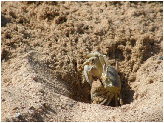 - Tiralongo, F.; Messina, G.; Marino, S.; Bellomo, S.; Vanadia, A.; Borzì, L.; Tibullo, D.; Di Stefano, A.; Lombardo, B.M. Abundance, distribution and ecology of the tufted ghost crab Ocypode cursor (Linnaeus, 1758) (Crustacea: Ocypodidae) from a recently colonized urban sandy beach, and new records from Sicily (central Mediterranean Sea). J. Sea Res. 2020, 156, 101832. [Google Scholar] [CrossRef]