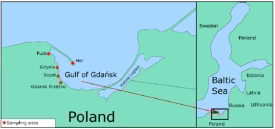 The map shows the sampling points in 5 coastal towns, Hel, Puck, Gdynia, Sopot, Gdańsk-Brzeźno, on the Gulf of Gdańsk.