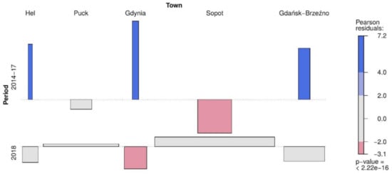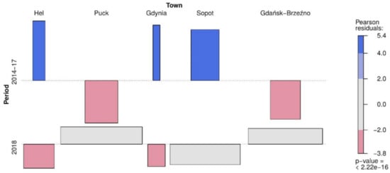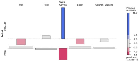 The relationship between the number of mold fungi Cladosporium sp. in air of the coastal towns (Hel, Puck, Gdynia, Sopot, Gdańsk-Brzeźno) in 2014–2017 vs. 2018. The blue color indicates that the observed value is higher than the expected value if the data were random. The red color specifies that the observed value is lower than the expected value if the data were random. The grey color represents the data where the concentrations are similar to observations under the null hypothesis where a test of independence is true.