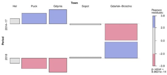 The relationship between the number of mold fungi Penicillium sp. in air of the coastal towns (Hel, Puck, Gdynia, Sopot, Gdańsk-Brzeźno) in 2014–2017 vs. 2018 was presented using the contingency tables. The blue color indicates that the observed value is higher than the expected value if the data were random. The red color specifies that the observed value is lower than the expected value if the data were random. The grey color represents the data where the concentrations are similar to observations under the null hypothesis where a test of independence is true.