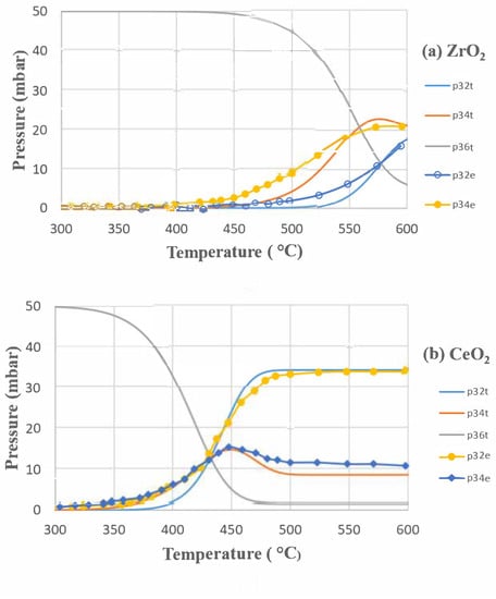 In Figure 2a,b the experimental and calculated dependencies of partial pressures of oxygen species 18O2, 18O16O and 16O2 on temperature are presented. Results are calculated for ZrO2 and CeO2. Experimental results are taken form literature Refs. [35,36]. The temperature programmed oxygen isotopic exchange experiment was performed at following conditions: the temperature increase speed 1.6 °C/min, specific surface area Sbet = 25 m2/g for ceria and Sbet = 25 m2/g for zirconia, mass of powder catalyst mcat = 0.25 g, initial pressure of 18O2 48 mbar and volume of reactor V = 12 cm3. The surface concentration of oxygen in ceria depending on crystallite orientation varies from 0.97 nm2 for (110) until 15.8 nm2 for (111) [35,36] and in these calculations was taken as 1.09× 1019 m2. Similarly using data from Ref. [36] for zirconia oxygen surface concentration was taken 1.09 × 1019 m−2. From the fitting of experimental curves presented in Figure 2, the values of activation energies of simple and complex heteroexchange reactions, diffusion and its pre-exponential terms were found. Values are written in Table 2.