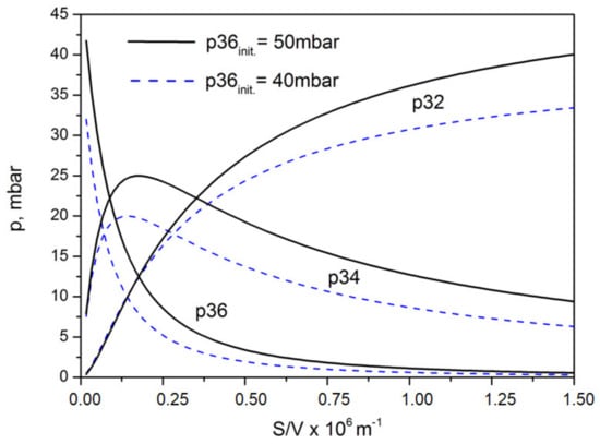 In Figure 3 the calculated curves of partial pressures of oxygen species at steady state regime as a dependency on ratio S/V are presented. The shapes of curves p34 and p32 significantly differs. The curve p34 pass maximum while the curve p32 goes up in whole interval of S/V. The position of maximum in curve p34 corresponds with position of cross section point of pressure curves of p32 and p36. The curves p32 and p34 cross each other and after the amount of species 16O2 at steady state becomes higher than 18O16O with further increase of S/V. The point at which curves p32 and p34 cross each other depends on total pressure: it shifts to lower values of S/V when total pressure decreases. It is seen in Figure 2 (dot lines).