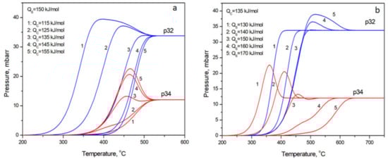 The results presented in Figure 4 were obtained at relatively high ratio of S/V, in the case when steady state pressures as p32 > p34. The case of relatively low ratio S/V when steady state pressures are p32 < p34 is considered in Figure 5. In Figure 5a the influence of QC is shown. It is seen that curves of p34 almost are not affected by changes of QC, but curves p32 are significantly affected by QC. At low values of QC curves p32 have big and broad maximums which decrease and finally disappear with increase of QC. In Figure 5a it is also seen that at low values of QC with increase of temperature species of 16O2 are formed firstly and 16O18O after. However, the situation reversely changes at high values of QC: 16O18O are formed first and then 16O2. The influence of QC in the case when steady state pressures fulfil condition p32 < p34 is presented in Figure 5b. Now, the change of QS significantly affects both curves. At higher values of QS the maximums in curves p32 start to appear and become broader with increase of QS. However, it is interesting to note that when maximum appears, the temperature of formation of 16O2 does not change any more with further increase of QS. The curves of p34 continuously shift to higher temperatures with increase of QS but the shape of curves remain the same and no maximums appear. At low values of QS with increase of temperature the species of 16O18O are formed firstly and then 16O2, but at high values of QS situation reversely changes: species 16O2 first and 16O18O after.
