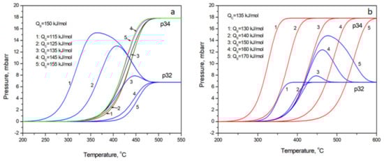 Experimental kinetic curves of oxygen species partial pressures registered during TPIE may have quite different shapes. For example, the curve p34 in Figure 2b has a maximum, but the curve p34 not. Many experimental results show that the maximums can be broad or narrow, high or low, or sometimes they are not formed at all. It depends on type of catalyst. In order to clarify this situation and to find some regularities the calculations were performed by varying activation energies of simple and complex heteroexchange. The influence of QS and QC (activation energies of simple and complex exchange) is analyzed in Figure 4a the calculated curves obtained by changing QC and (b) the curves by changing QS are presented. From Figure 4a it is seen that with increase of QC the temperature at which the molecules 16O2 start to form shifts to higher temperatures and this shift at the beginning is very significant and later reduces (see 4 and 5 curves). However, the temperature of formation of 16O18O species almost does not depend on QC but the shape of p34 curves significantly depends on QC. At low values of QC the maximum is not observed in those curves, but it appears and increases with the increase of QC. In opposite it is for p32 curves, at low QC the broad but not well-expressed maximum is seen but with increase of QC it disappears. The influence of QS which presented in Figure 4b is different. The temperature of formation of 16O18O species is very sensitive on QS and it is not so sensitive for formation of 16O2 molecules, especially at higher values of QS (see 4 and 5 curves of p32). Maximums in p34 curves are well expressed at lower values of QS and disappear at high values of QS. In opposite it is for p32 curves, no maximums are seen at low values of QS and broad maximums appear at high values of QS. From Figure 4a,b it is seen that QS and QC values determine which oxygen species with increase of temperature will be formed first. Depending on QS and QC values with increase of temperature the oxygen species 16O18O can start to form first and 16O2 after or in opposite, 16O2 first and 16O18O after. The cases when both oxygen species start to form together at the same temperature also can be observed in Figure 4.