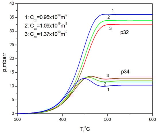 Considering the steady state pressures of oxygen species, it is important to note that additionally to ratio S/V, there is another parameter which influences the steady state pressures and modifies the kinetic. This parameter is the initial surface concentration of oxygen COX. In the model this parameter is involved through the initial value of surface concentration c32. Parameter c32 is variable but at the beginning at t = 0 it equals to COX: c32 (t = 0) = COX. Surface concentration of oxygen depends on the type of catalyst, method of preparation and also orientation of oxide crystallite grains [35,36]. The influence of oxygen surface concentration is shown in Figure 6 where the partial pressure curves calculated for different surface concentration of oxygen COX are presented. It is seen that in contrast with curves presented in Figure 4 and Figure 5, the curves of Figure 6 at steady state regime differs. Since COX depends on crystallite surface orientation curves presented in Figure 6 can also be considered as presentation of the influence of crystallite surface orientation catalysts. Parameter COX affects both, the temperature of formation of oxygen species and the pressure at steady state regime.