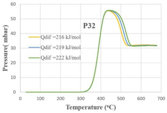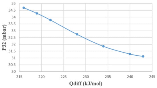 In the heterogeneous exchange, the process of diffusion is very important and influences the kinetic curves. The influence of bulk diffusion process is shown in Figure 7 where the calculated kinetic curves of partial pressure of oxygen specie 16O2 as a dependency on temperature (which increases with time in TPIE) are presented. The curves are calculated at different values of diffusion activation energy at constant pre-exponential factor Adif = 1.90·10−24 m2s−1. All other parameters were kept as constants and were the same as in calculations presented in in Figure 2b. It is seen that diffusion significantly influences the shape of kinetic curves in the transition period and at steady state. The partial pressure at steady state of 16O2 decreases with increase of Qdif. This result is logic, because the increase of Qdif means the decrease of diffusivity. At higher diffusivity more amount of 16O2 appear in gas phase because of diffusion of oxygen atoms from the bulk of catalyst. In order to see this effect in more detail the dependence of 16O2 partial pressure at steady state regime is presented in Figure 8. The considered interval is narrow and change of pressure is small, nevertheless, the nonlinear dependence of steady state partial pressure on diffusivity can be seen.