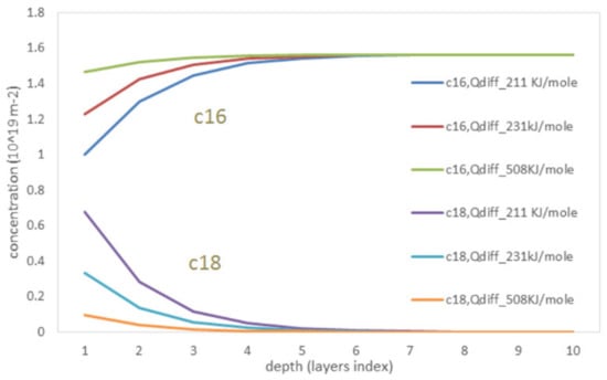 In order to check the validity of model the concentration distribution in deeper layers, the concentration deps profiles of atoms 16O and 18O were calculated. Results are presented in Figure 9, where depth profile curves are calculated for different values of Qdif. Obtained curves are typical diffusion curves and shows the correctness of calculations. However, the bulk diffusion on powder catalysts is not so simple as discussed above presenting Figure 1 and Equation (12) and depth profile curves at higher diffusivity can be more complex. It is seen that with increase of diffusivity (decrease of Qdif) the concentration of 16O at the surface layers decreases and is replaced by oxygen 18O coming from gas phase. It means what more oxygen 16O must appear in gas phase forming oxygen species 16O2 and 16O18O.