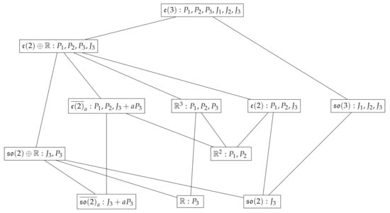At present time, the classification of all subalgebras of the algebra up to conjugacy classes of is well known (see, for example, [7]); the corresponding Hasse diagram is shown in Figure 1. The diagram is the graph whose vertices correspond to the inequivalent subalgebras in , and the edges indicate the presence of the inclusion relation between the subalgebras.
