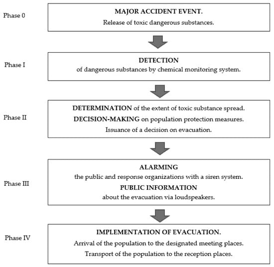 A number of models [26,27] have been developed for evacuation that take into account human behaviour and movement. These models mostly deal with indoor and outdoor evacuations in small settlements and large cities. However, these models do not approach population protection measures in a complex way, but focus exclusively on the evacuation process. In fact, the population protection measure is a complex process that contains the following steps: incident detection, evacuation order issue, delivery order to public via transmitters, preparation for evacuation, movement through the evacuation network, arrival at safety zone, and verification phase [28]. The application of these phases in a special case of a major accident involving dangerous substances is shown in Figure 1.