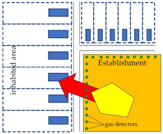 Figure 2 presents schematically that the chemical monitoring stations were installed with an average density of 20° in the vicinity of the plant with circular coverage in all directions. The dangerous installation is marked in yellow. The direction of the gas propagation is marked in red, building in the inhabited area indicates in blue and the monitoring stations are marked in green [32].