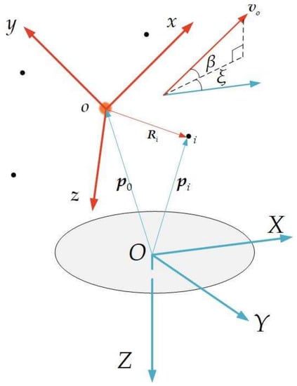 We index the UAV in the cluster as , . The position vector of is . The origin of cluster coordinate system (denoted as ) coincides with the initial barycenter of the cluster. The position vector and the velocity vector of the barycenter of the cluster in the system are given by Equation (1). The axis coincides with the cluster velocity , and the axis lies in the vertical plane and is perpendicular to the axis downward; the axis direction is determined by the right-hand rule, as shown in Figure 1.