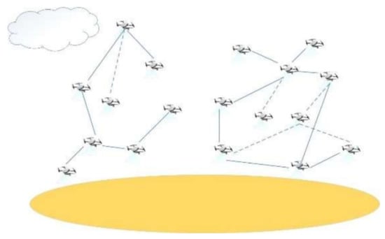 The increasing application of unmanned aerial vehicles (UAVs) has resulted in complex scenarios. Apart from military operations such as target destruction and cooperative investigation [1], civilian applications can also benefit from UAV technology, such as environmental monitoring, precision agriculture [2,3], disaster relief [4], and traffic monitoring [5]. As it becomes increasingly difficult for a single UAV to meet the needs of complex tasks [6], the recent development of technologies such as cluster intelligence has enabled applications with small UAV cluster systems. Using multiple UAVs in a system is challenging due the communication problems between them, such as the damage of some UAVs and the interruption of communication links, which may affect the data transmission within the cluster. Therefore, rebuilding a connected communication network for a cluster with communication problems is essential for the cooperation of UAVs [7].