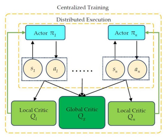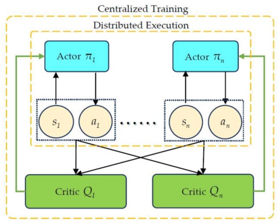 As shown in Figure 3, the MADDPG adopts the framework of centralized training with decentralized execution. Each agent is associated with an actor network and a centralized critic network. In the training, a single agent observes its state, outputs actions based on the actor network, and then obtains the corresponding rewards and new states from the environment. The critic network obtains the action and state information of all agents and outputs the state–action value for the state and action from a global perspective. Then, the actor network is updated by the state–action value. In the execution, without the critic network, the actor network outputs the actions based on the local observation.